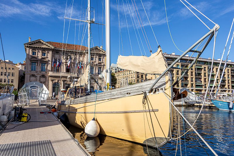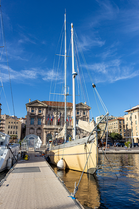 La Louise, goélette de 19 mètres, sur le quai d'honneur du Vieux Port à Marseille, devant la mairie.